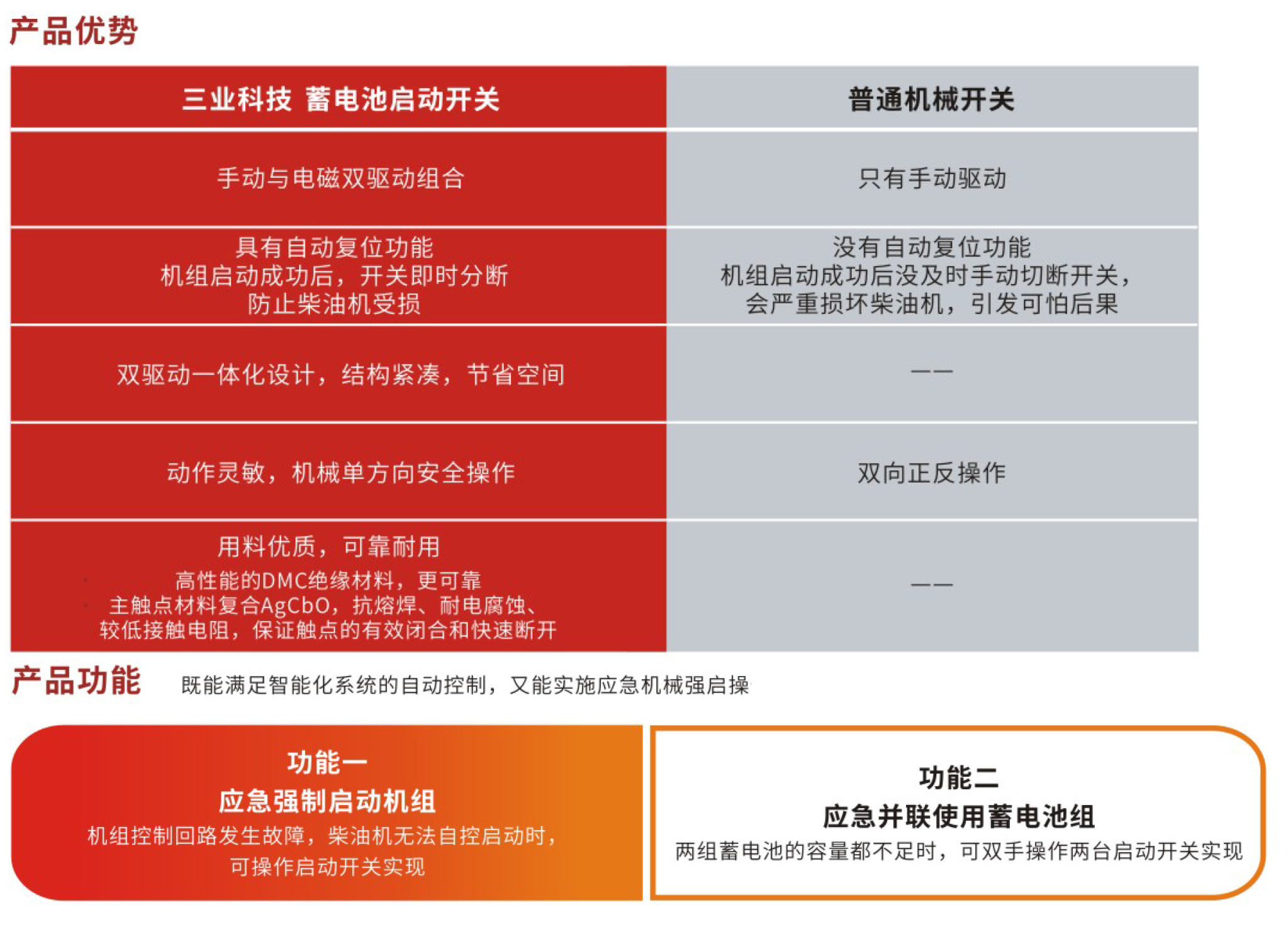 手动机械操作控制是采用弹簧储能快速分合的模式。当柴油机的二次控制回路发生故障时,手动操作产品手柄,常开触头即瞬动闭合。启动成功,松开手柄,产品即时分断,应急机械启动过程结束。